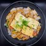 Deep fried tofu with teriyaki sauce with rice, miso soup, and salad